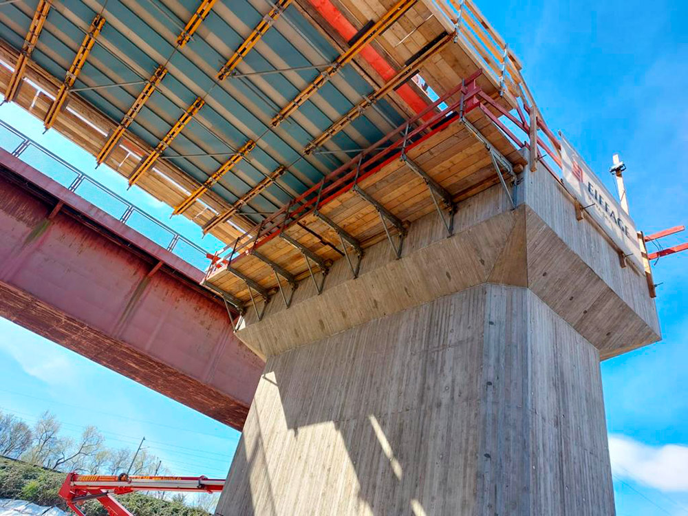 den knapp 12,00 m hohen Mittelpfeiler der EÜ kommt eine VMK-Holzträgerschalung zum Einsatz. Insgesamt wurden ca. 550 m³ Beton und 78 Tonnen Bewehrungsstahl im