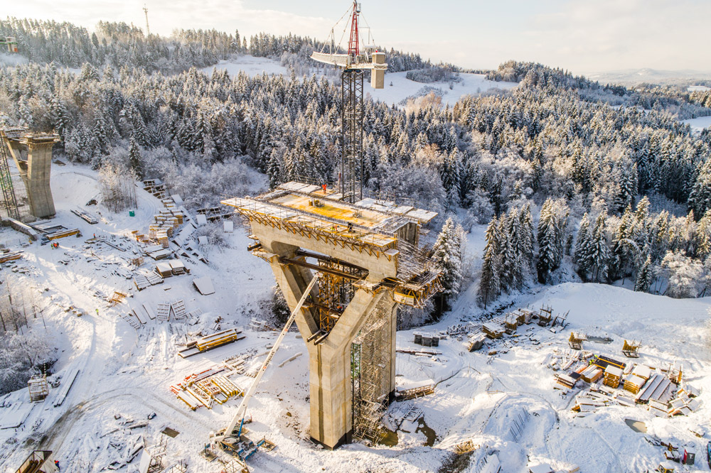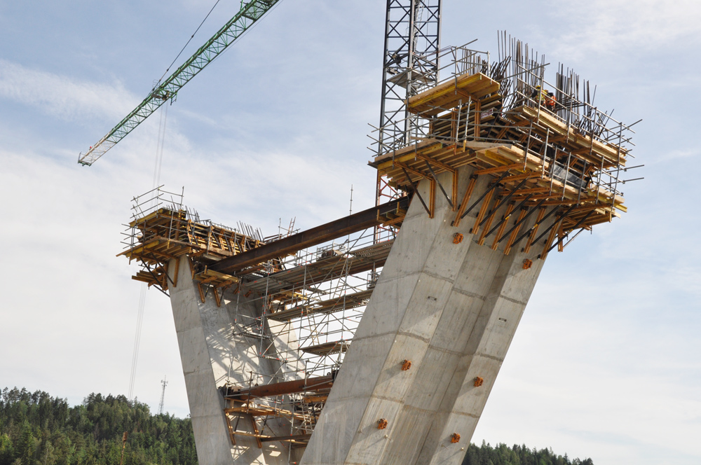 Zur Anpassung an den Neigungswinkel des Bauwerks haben wir BMK-Konsolen zusammen mit der ATR-Selbstkletterschalung eingesetzt. Durch dieses System aus MK - Abstützböcken und Hydraulikzylindern, konnte man an der Außenseite des Pfeilers die Schalung ohne Kran in den nächsten Takt bewegen (selbstkletternd).