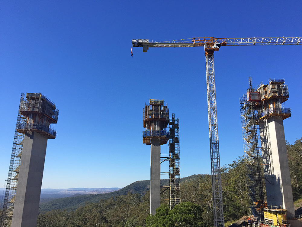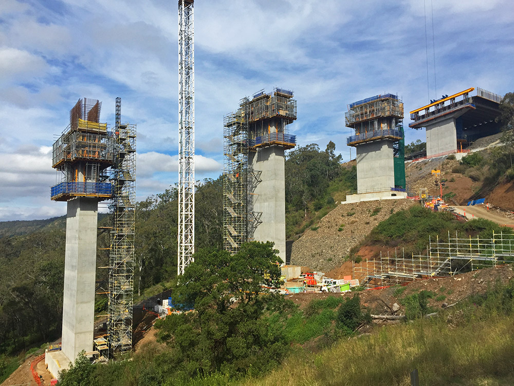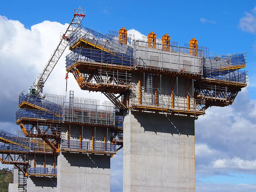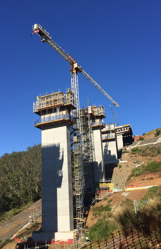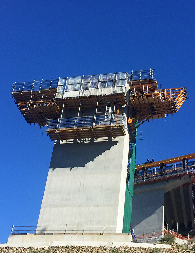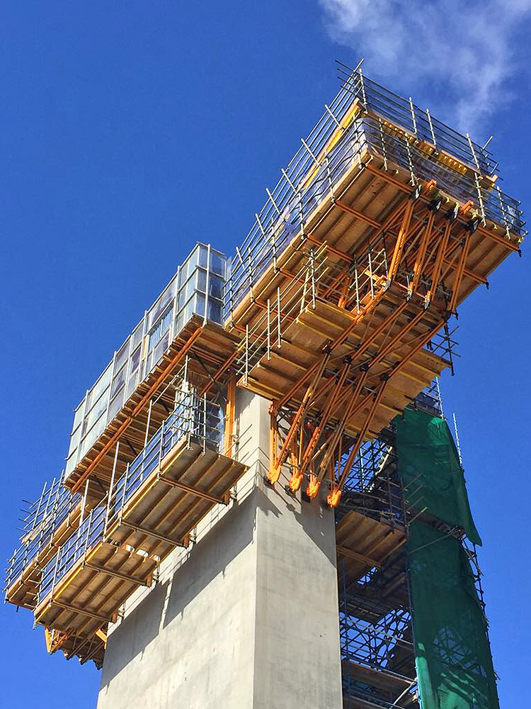 In Zusammenarbeit mit ACROW-UNISPAN wurden 21 Pfeiler mit einer Höhe von 46 m mit der Kletterschalung RKS hergestellt. Das RKS-Klettersystem, bietet eine große Vielseitig- und Anpassungsfähigkeit an die Geometrien und Anforderungen vor Ort. Arbeitsplattformen und Sicherheitszugänge erweitern das System.