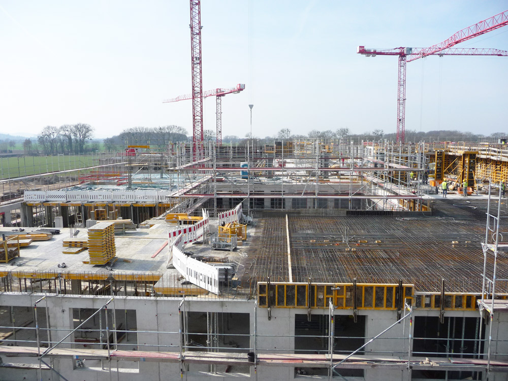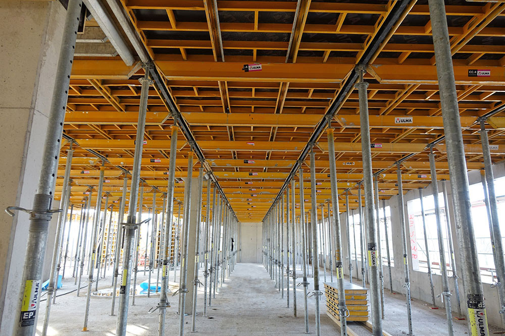 Zum schnellen Fortschritt der Arbeiten hat in besonderer Weise die Verwendung der CC4 Moduldeckenschalung von ULMA beigetragen, die im Gegensatz zu herkömmlicher Deckenschalung bereits nach drei Tagen ausgeschalt und für den nächsten Betonierabschnitt bereitgestellt werden kann.