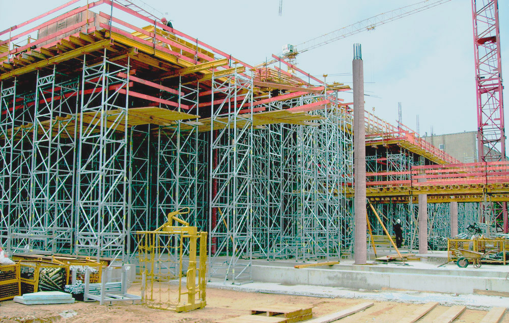 Etwa 560 Stütztürme wurden mit mehr als 4.100 m Metallkonstruktionen des T-60-Stützsystems montiert. Sie dienten mit ihren Kragarmen als Traggerüst für die Unterzüge der Unterzüge in den beiden Obergeschossen. Dieses Traggerüstsystem ist vor allem flexibel, da es aus 8 Grundelementen besteht, die variable Bodenkombinationen ermöglichen und mit einem Kran versetzt werden können. Mit all diesen Materialien wurden spezifische und flexible Lösungen bereitgestellt, die es dem Unternehmen ermöglichten, sich an die Veränderungen anzupassen, die während des Bauprozesses auftraten.