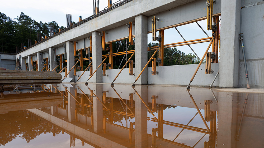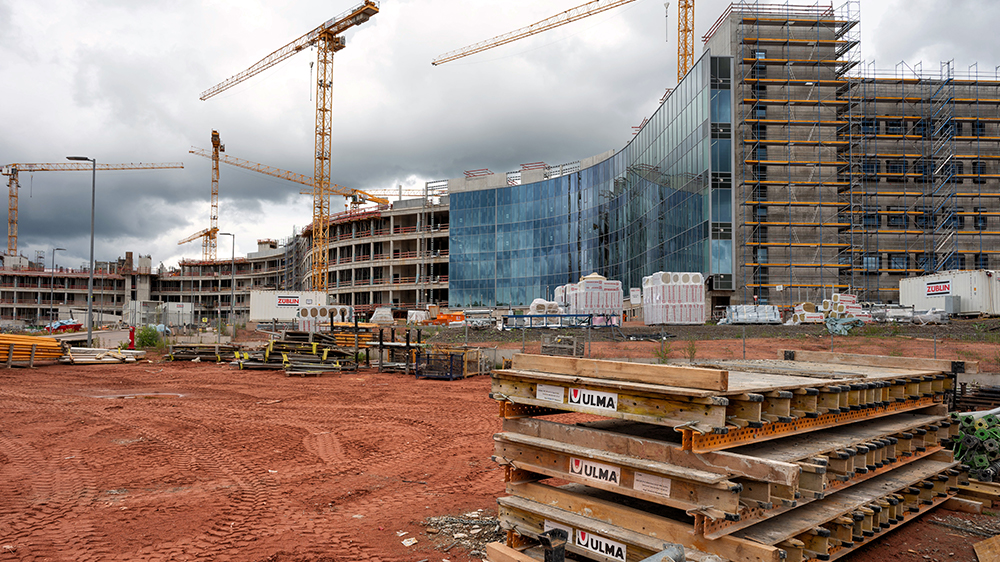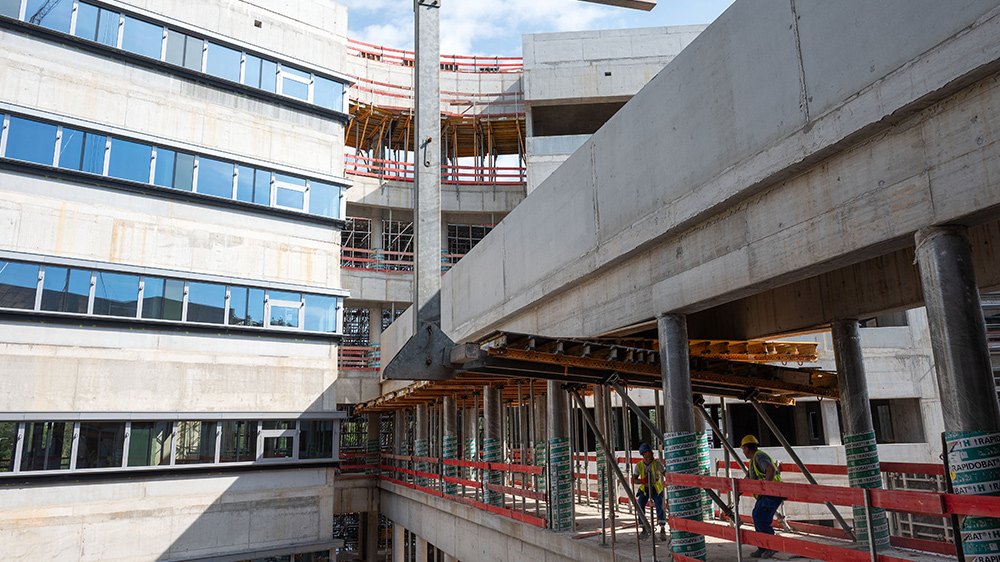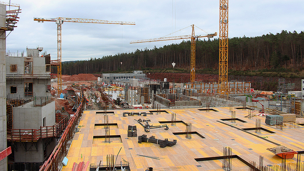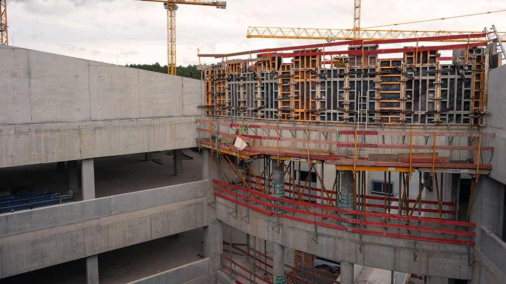 Für die geschwungene Fassade des US-Militärkrankenhauses kamen Randdeckentische zum Einsatz, die weit ausgekragt wurden. In den schmalen Bereichen mit einer Tiefe von 1,40 m und 1,70 m lieferten wir Sondertische, die eigens für das Projekt in Weilerbach angefertigt wurden. Im Teilprojekt 2, das den Bau der Behandlungsräume und Operationssäle umfasste, wurde im Bereich der Bandfassade mit einer Fassadenschalung gearbeitet. Hierfür nutzten die Rohbauer als Tragkonstruktion unser MK-System.
