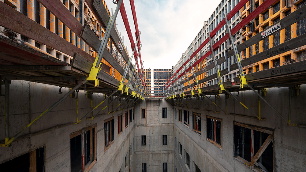 Die Treppenhauskerne und Aufzugschächte wurden mithilfe unserer Kletterkonsole BMK und der Schachtbühne KSP vorgeklettert. Auf Nachlaufbühnen wurde dabei verzichtet – einerseits aus Kostengründen, andererseits, um möglichst große Bewegungsfreiheit zu gewährleisten. Zudem wurden die Arbeiten in dem darunter liegenden Geschoss dadurch nicht beeinträchtigt.
