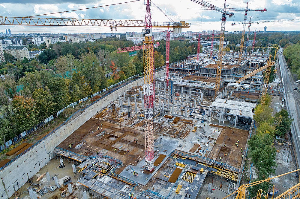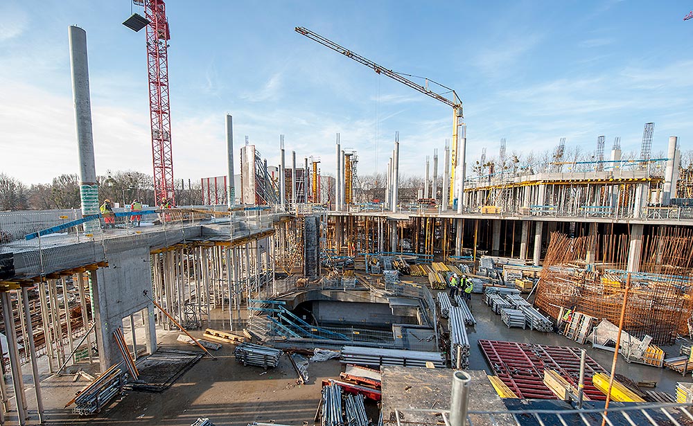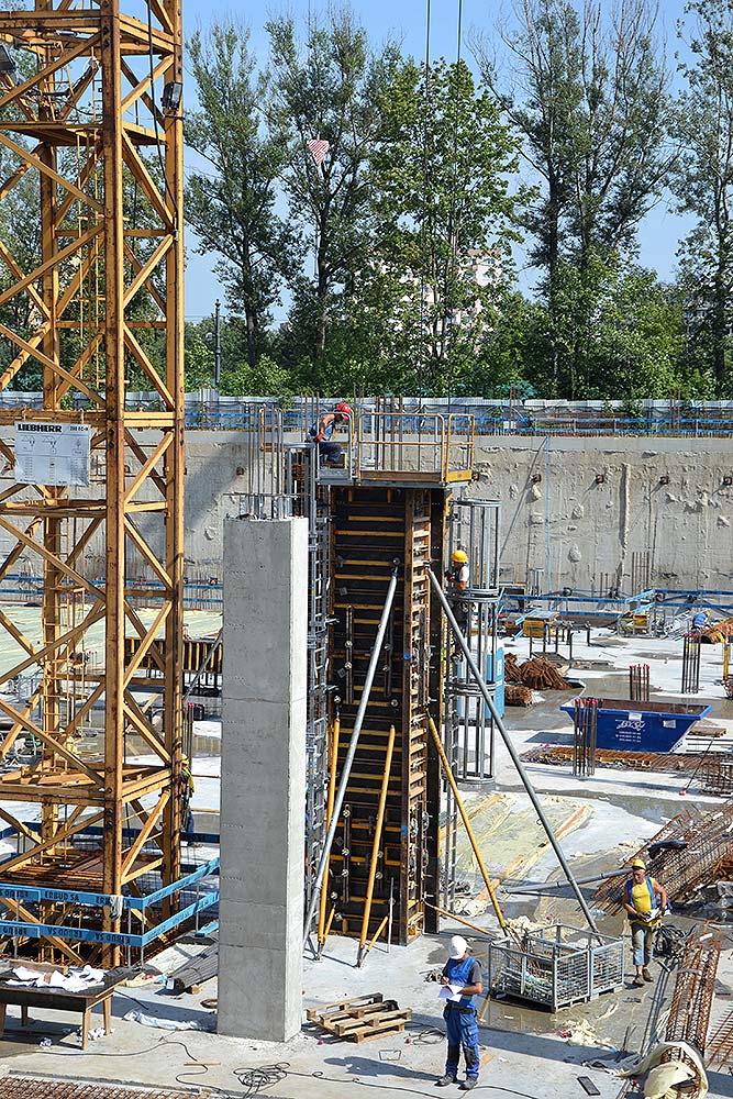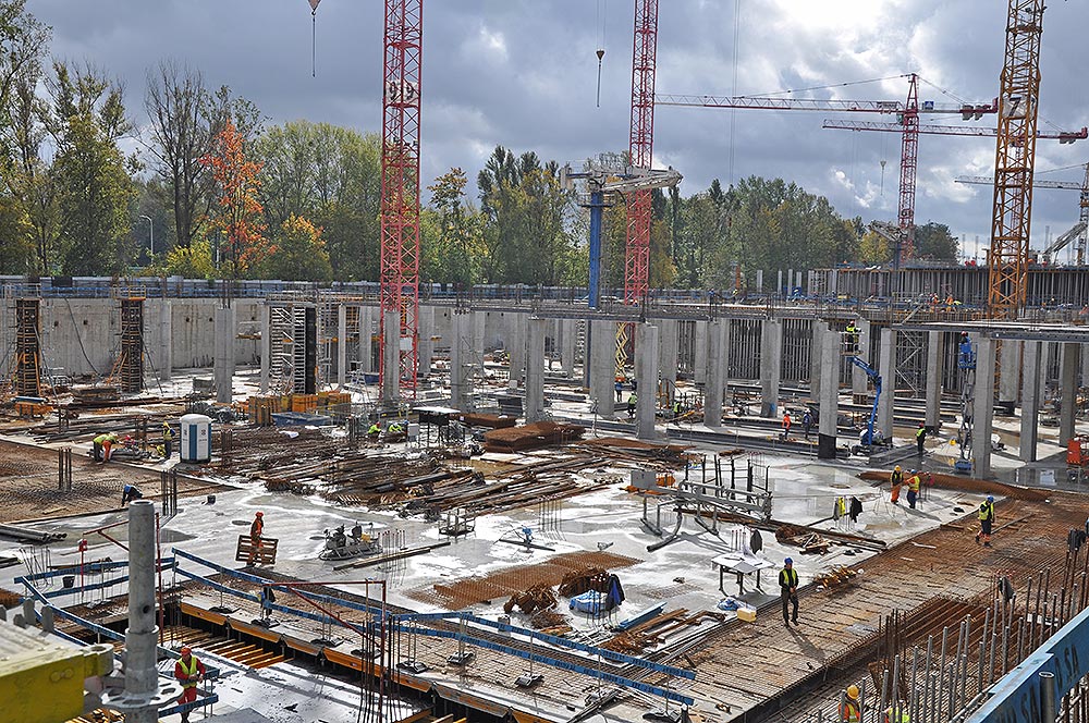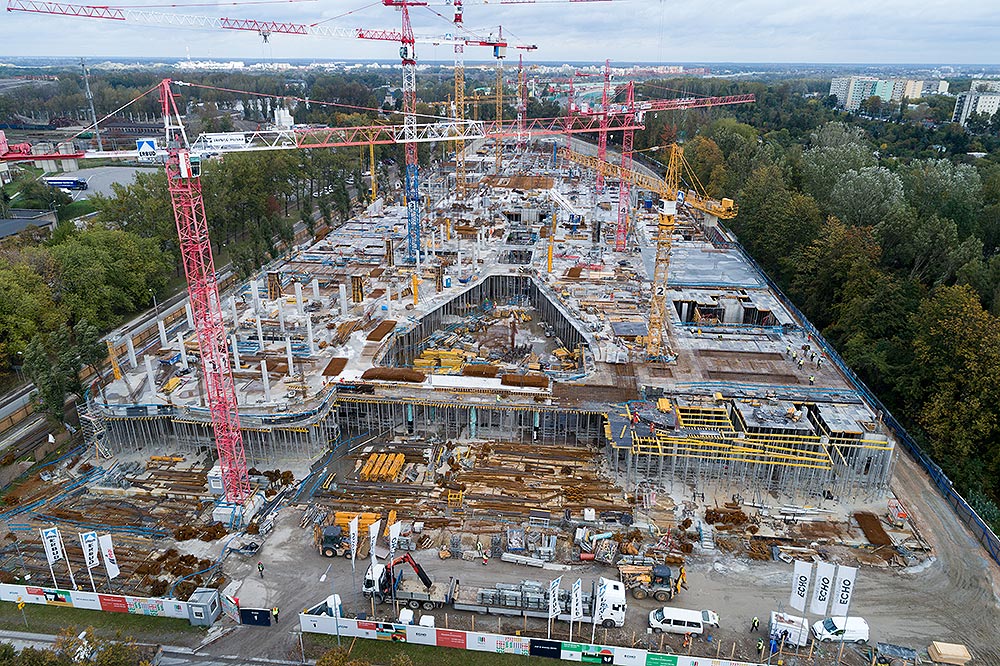 Mit dem Bau des großen Einkaufszentrums Mlociny (Warschau) haben wir ein ehrgeiziges Projekt realisiert, bei dem mehrere Schalungs- und Gerüstsysteme gleichzeitig zum Einsatz kamen, um Lösungen für eine maximale Produktivität in jeder Phase des Projekts zu finden. Die leichte Bauweise der Moduldeckenschalung und der Aluminiumstützen, wie CC-4 und ALUPROP, und die Verwendung einer geringeren Anzahl von Stützen hat die Montagearbeiten beschleunigt und den Einsatz von Kränen reduziert.