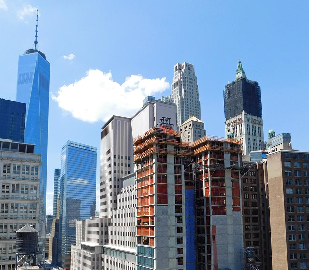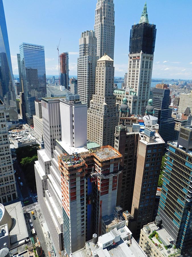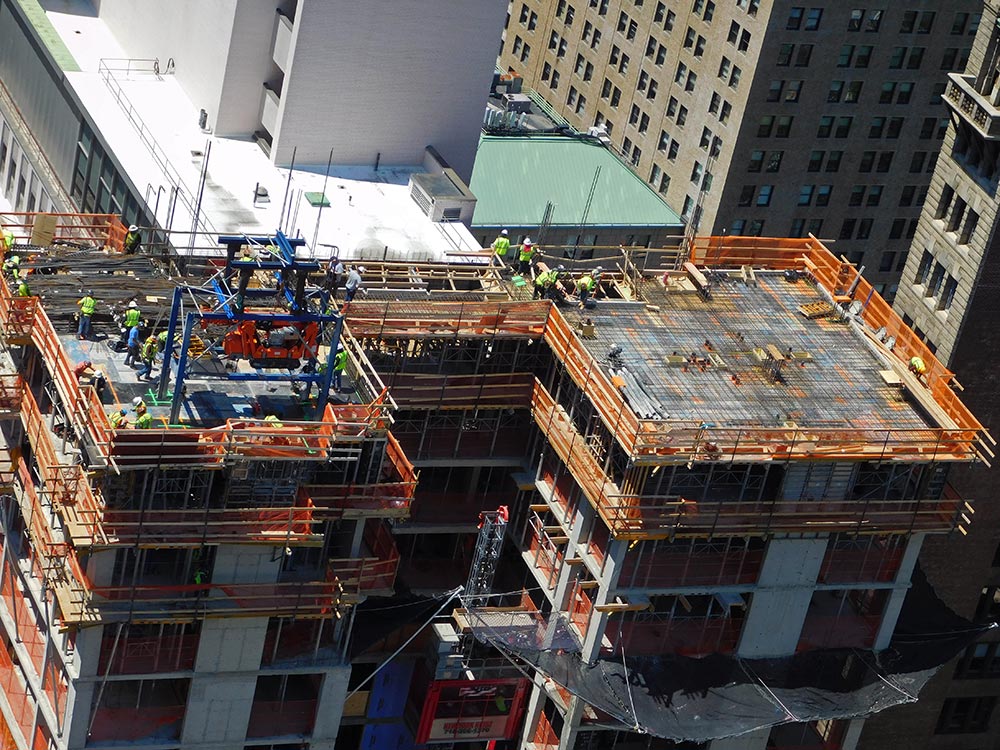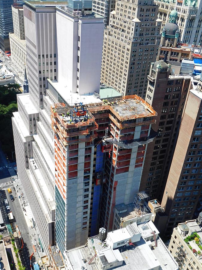 Ein 111 m hoher Turm, bei dem wir die CC-4-Moduldeckenschalung verwendet haben, da sie sehr leichte Fallköpfe hat, perfekt für Räume, in denen die Sicherheitsanforderungen hoch sind. Dieses Material hat den Bedarf an Ausrüstung vor Ort und den Einsatz des Krans reduziert. Dadurch, dass weniger Stützen benötigt werden, werden die Bewegungen unter der Decke sowie die Bewegung von Materialien erleichtert, was sehr wichtig ist, wenn das Gebäude in die Höhe wächst. Zur Abstützung der vier Arbeitsebenen wurden neben CC-4 auch ALUPROP-Aluminiumstützen verwendet, die sich bei der Abstützung der drei unteren Stockwerke als sehr effektiv erwiesen haben.