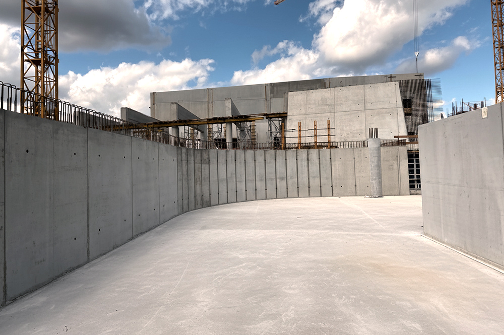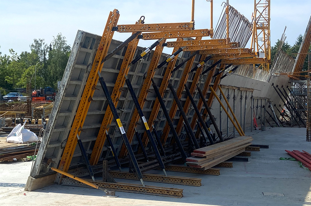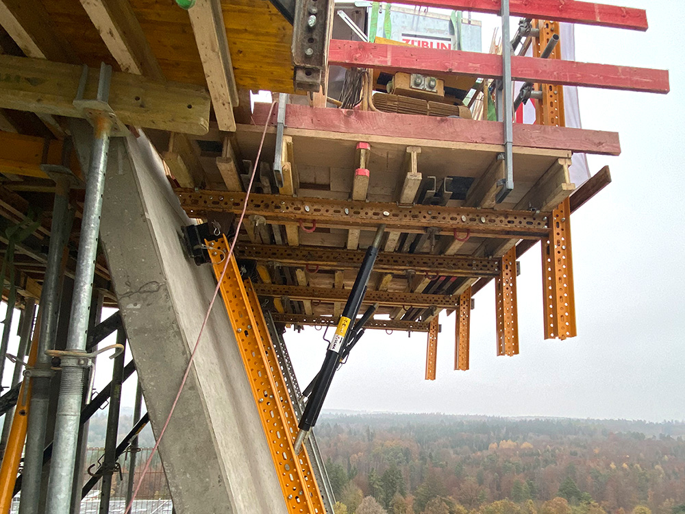 Um die komplexen Geometrien umzusetzen, setzten wir auf unsere konfigurierbare Kletterkonsole BMK und die einseitig verankerbare Rahmenschalung BATEK. Diese Kombination gewährleistete nicht nur die notwendige Flexibilität, sondern auch maximale Arbeitssicherheit, da die Anker von innen bedient werden konnten. Für spezielle Anforderungen wie die elliptische Sonderschalung einer runden Stütze entwickelten wir individuelle Lösungen.