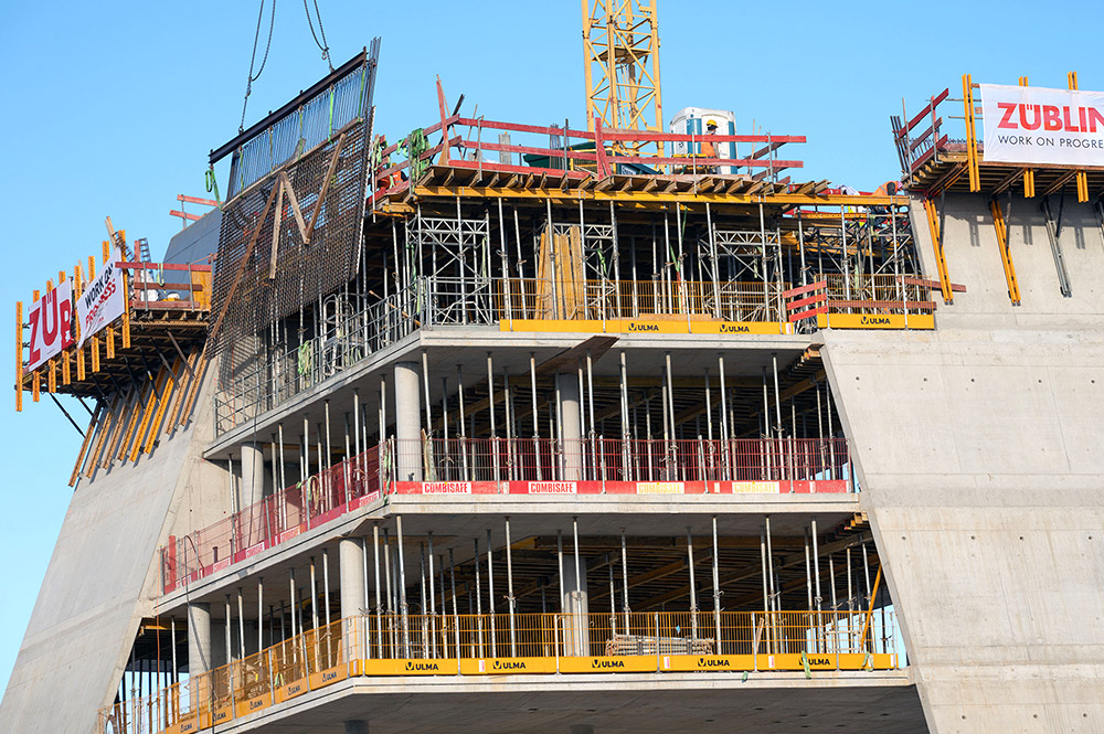 Ursprünglich waren 11 bis 14 Tage pro Stockwerk vorgesehen. Durch optimierte Prozesse und eingespielte Abläufe haben wir die Bauzeit auf fünf bis sieben Tage verkürzt – in den oberen Etagen sogar auf unter eine Woche. Auch in den Logistikbereichen erzielten wir Zeitgewinne: Mit der hochtragfähigen Schachtbühne KSP und der Rahmenschalung ORMA setzten wir Takte von 9,30 Metern um und erreichten höchste Sichtbetonqualität (SB 3).