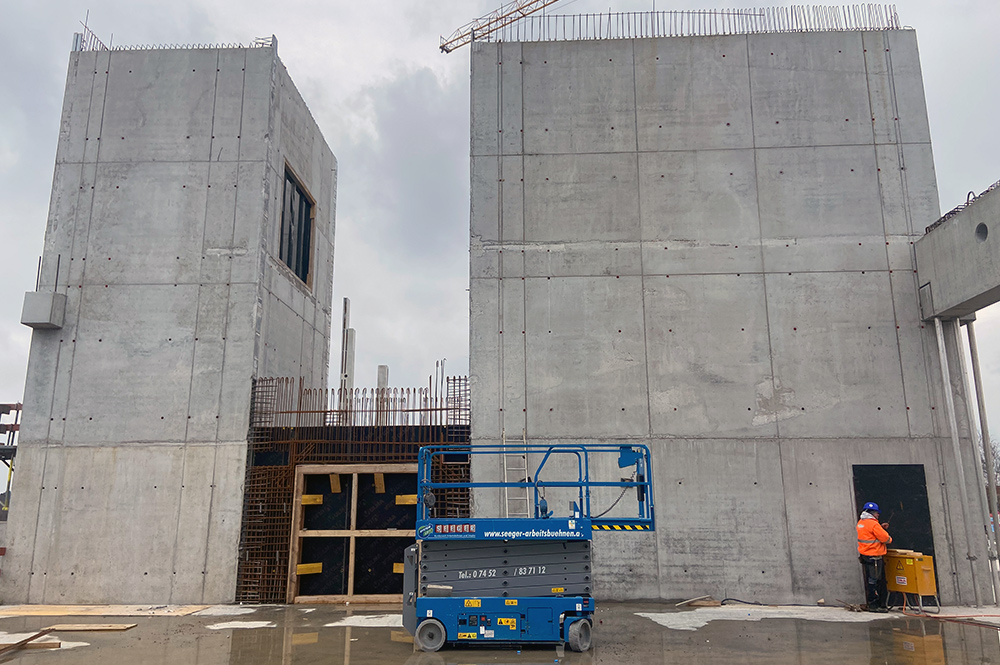 Für das neue Dynamikzentrum von Häfele in Nagold haben wir den Rohbau in Rekordzeit realisiert. Der multifunktionale Gebäudekomplex vereint moderne Logistik, Ausstellungsflächen und Gemeinschaftsbereiche – und überzeugt durch seine außergewöhnliche Architektur. Besonders markant ist der rund 50 Meter hohe Turm mit geneigten Außenwänden im Neigungswinkel von 70 Grad.