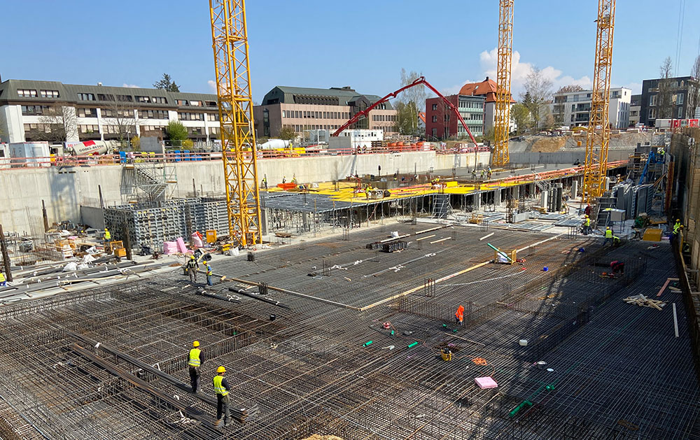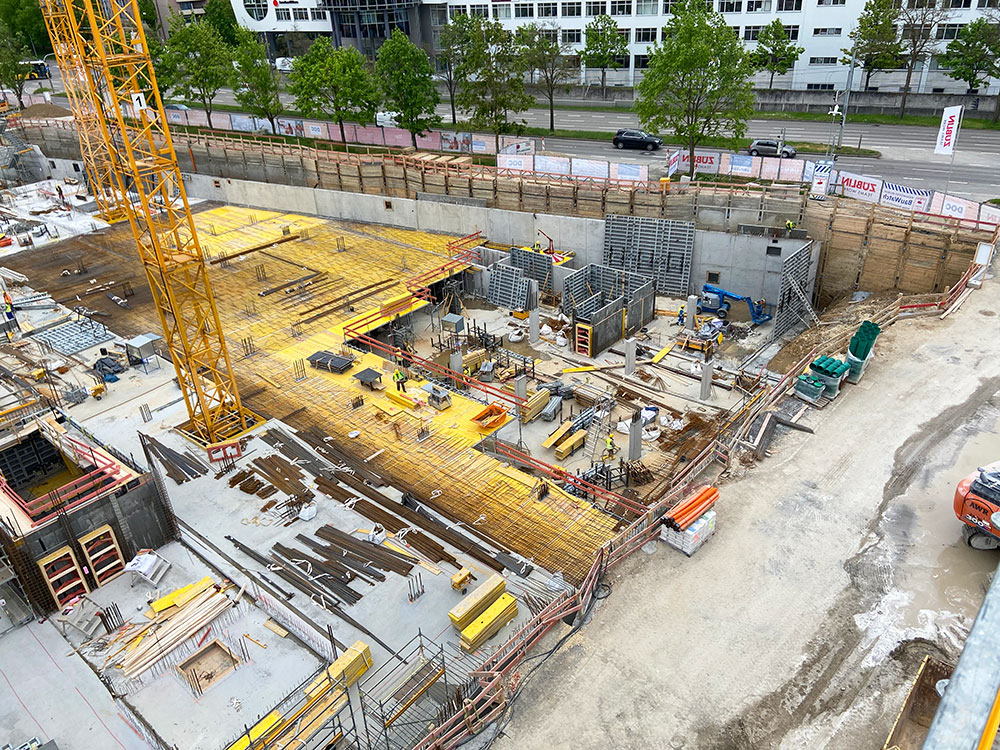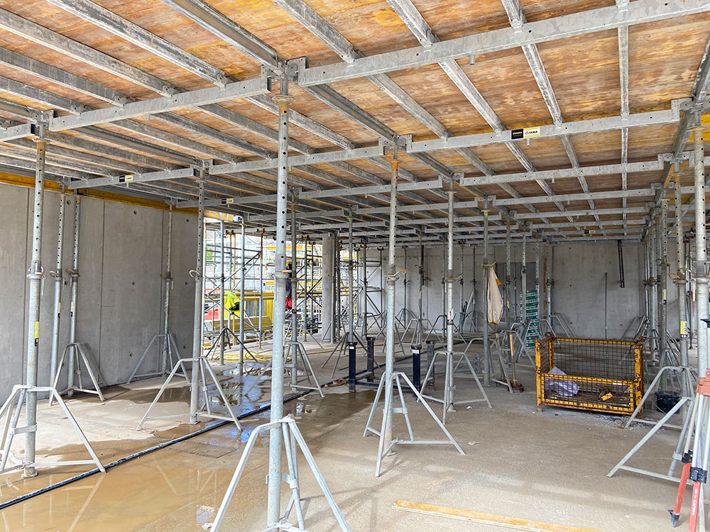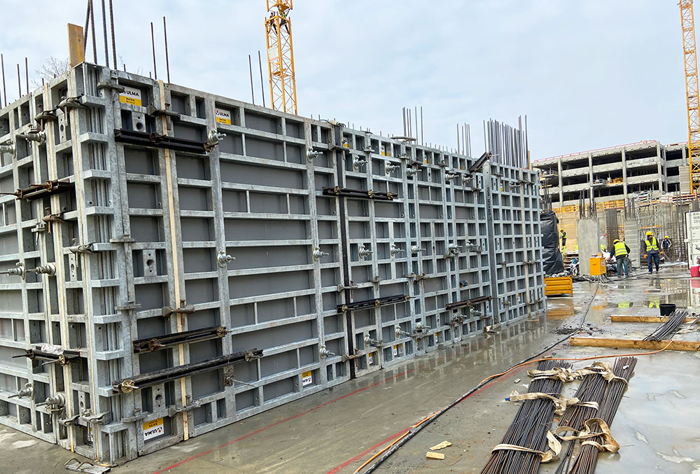 Eine weitere Anforderung des Projekts war es, die Umfassungswände über zwei Geschosse in einem Zug zu errichten, wobei die dafür notwendige Wandschalung nur von einer Seite bedienbar sein muss. Aus diesem Grund kam die Modulschalung BATEK zum Einsatz.