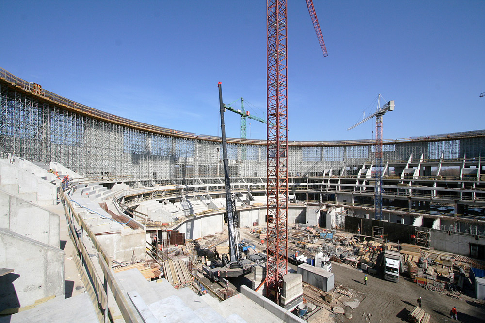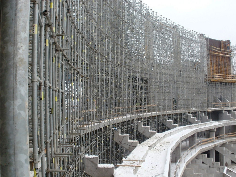 Die Decken wurden auf ENKOFLEX betoniert und mit EP Stützen, ALUPROP oder T-60 Traggerüsten unterstützt. Um die Risiken durch die erhöhten Lasten zu mindern, wurden Tribünen mit EP Stützen unterstellt. Die Durchfahrten und großen Spannweiten wurden unter Verwendung von Stahlprofilen und MK Stahlriegeln gebaut.