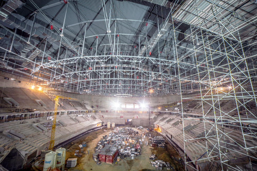 Darüber hinaus setzte man das BRIO Modulgerüst auf der Baustelle ein, um mobile Ausschalgerüste für die Bewehrungsarbeiten zu bauen. BRIO wurde auch verwendet, um ei ne Arbeitsplattform von 70 m Länge und einer Fläche von 670 m² zu errichten, um die Heizungs- und Lüftungssysteme für die Tribünen im Inneren der Halle zu installieren.