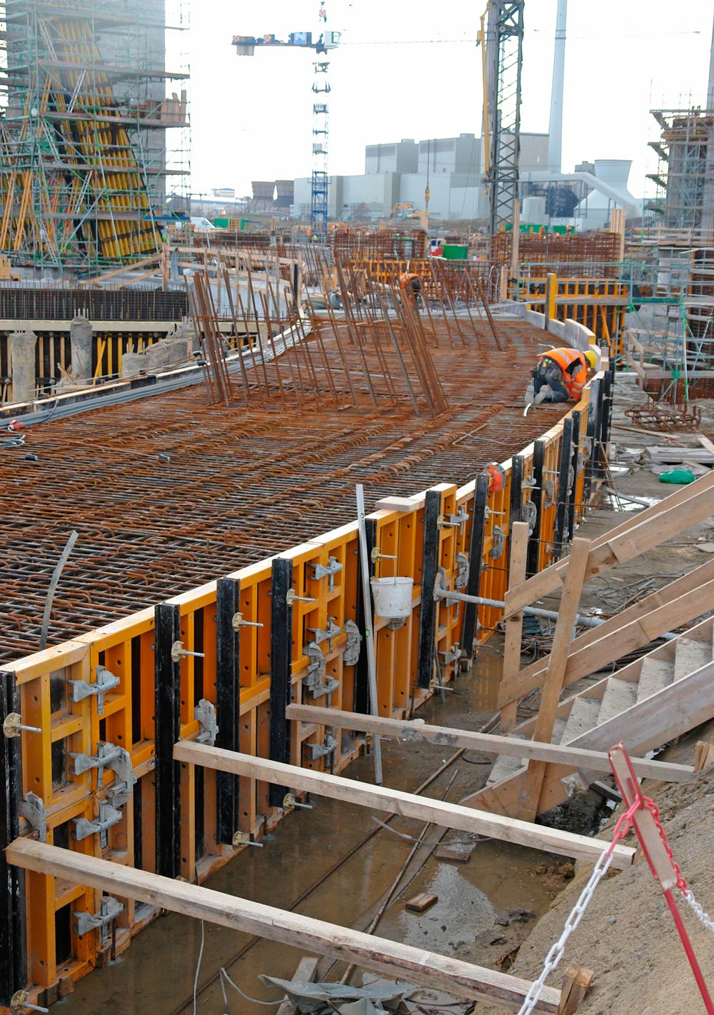 In der ersten Phase wurden ca. 30.000 m³ Beton mit verschiedenen Schalungssystemen zum Bau von Wänden, Stützen und Decken für Maschinenraum, Kesselbereich, Kühlturm und Nebengebäude verwendet.