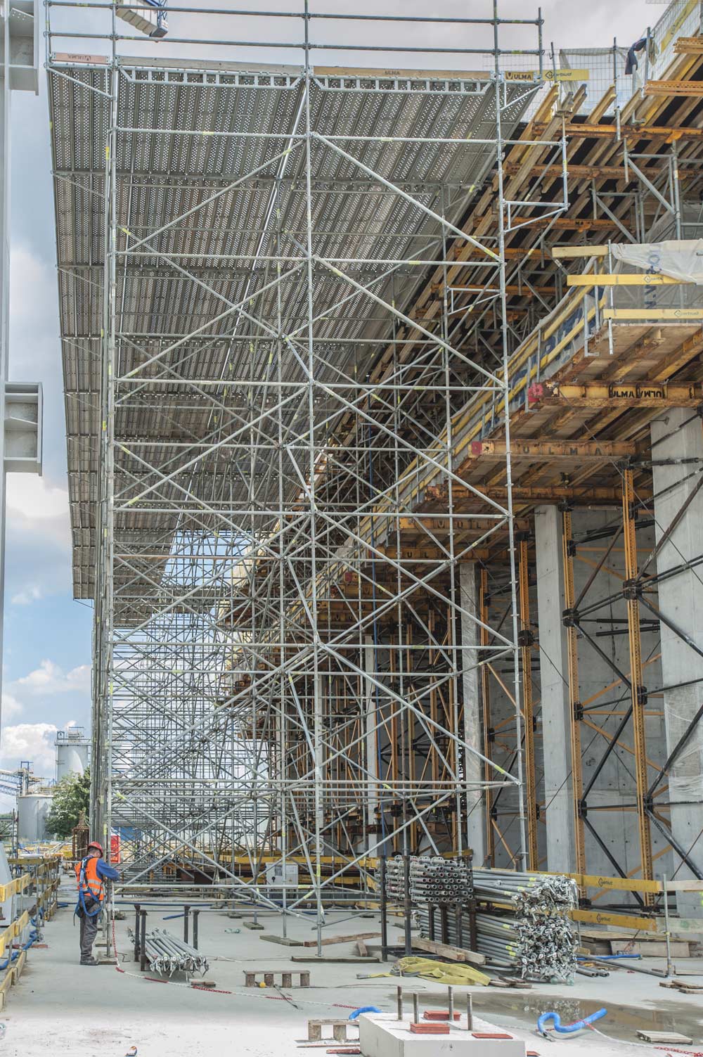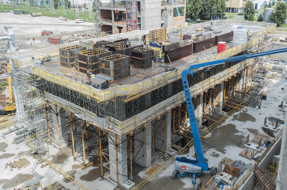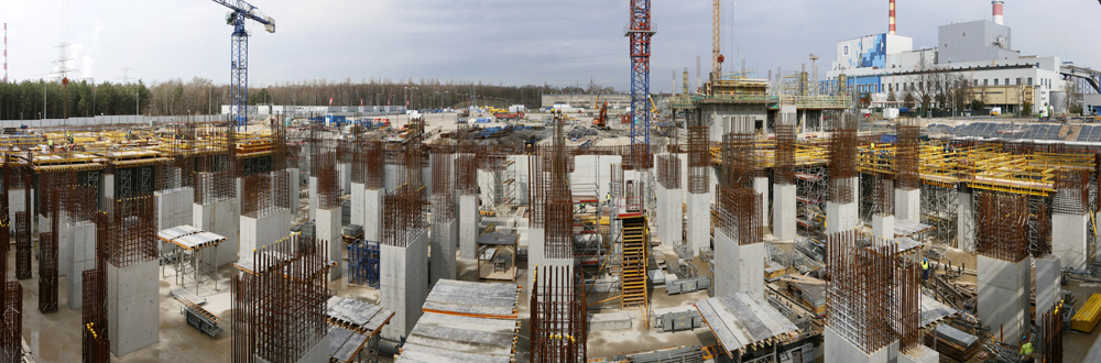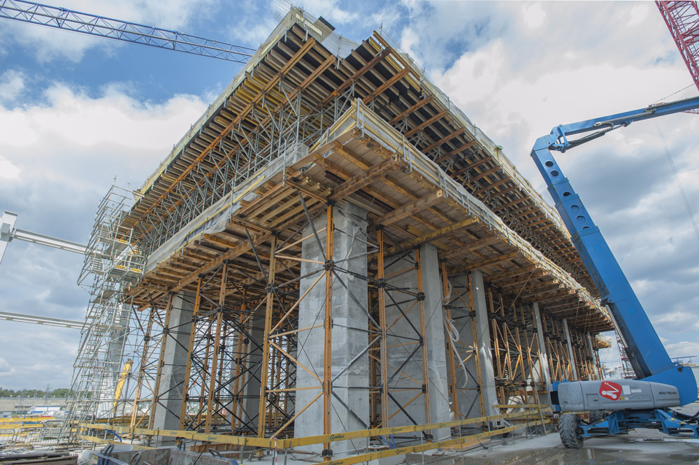 Die Wände, Pfeiler und Decken sind sehr dick und hoch, sodass sie Systeme mit hoher Tragfähigkeit erfordern. Im Maschinenraum, einem der aufwendigsten Bauwerke des Kraftwerks, wurde eine zweigeschossige Konstruktion aus MK- und T-60- Traggerüst zur Herstellung von 2,38 und 3,90 m dicken Decken eingesetzt.