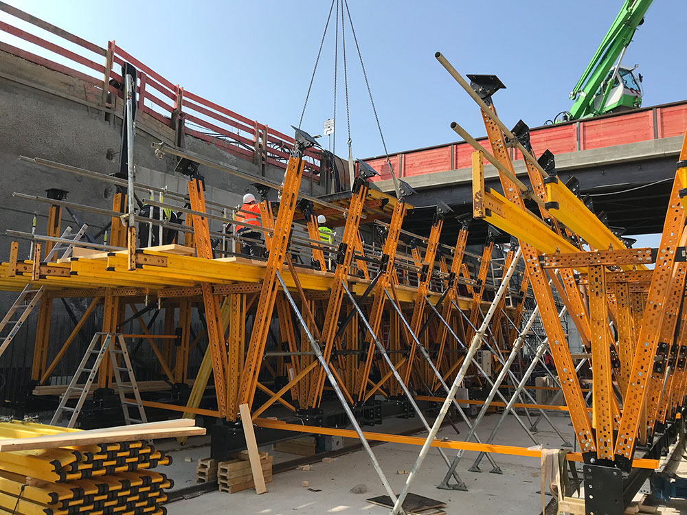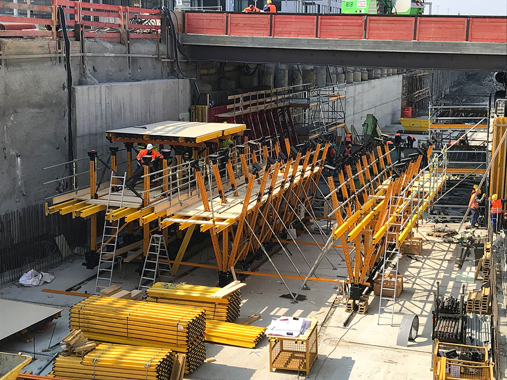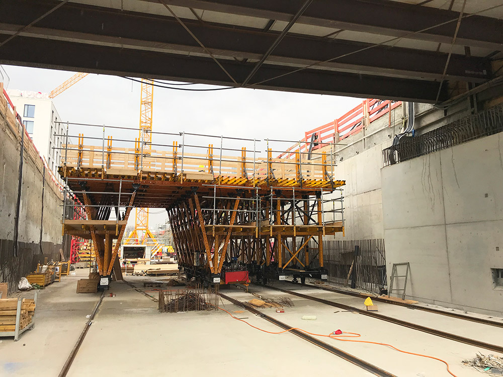 Im Rahmen des individuell auf die Baustellensituation in Stuttgart zugeschnittenen Schalungskonzepts wurde die Schalwagenkonstruktion auf Basis der Verwendung von MK-Riegeln von ULMA so ausgeführt, dass ein sicherer Abtrag der Lasten aus der Schalung in die Sohle über jeweils zwei Reihen von vertikalen Stützen erfolgt. Diese Stützen sind in Längsrichtung des Schalwagens ausgesteift, um die Gesamtkonstruktion zu stabilisieren und die längs verlaufenden Lasten aufzunehmen. Die vertikalen Lasten werden über die Fahrträger in die Gründung abgeleitet. Während des Betoniervorgangs erfolgt die Lastableitung über Hydraulikzylinder und Titan-Absenkkeile, während des Verfahrens über die Rollen des Schalwagens. „Um ein höchst mögliches Maß an Arbeitssicherheit zu garantieren, wurde der Schalwagen bereits in Rödermark zu transportfähigen Einheiten vormoniert“, erläutert Fiebig einen weiteren wesentlichen Vorteil des ULMA-Schalwagenkonzepts. „Dies hatte den Effekt, dass die untere Arbeitsebene und damit eine Absturzsicherung bereits zum Beginn der Betonage vollumfänglich zur Verfügung stand“, so Fiebig weiter.
