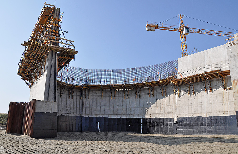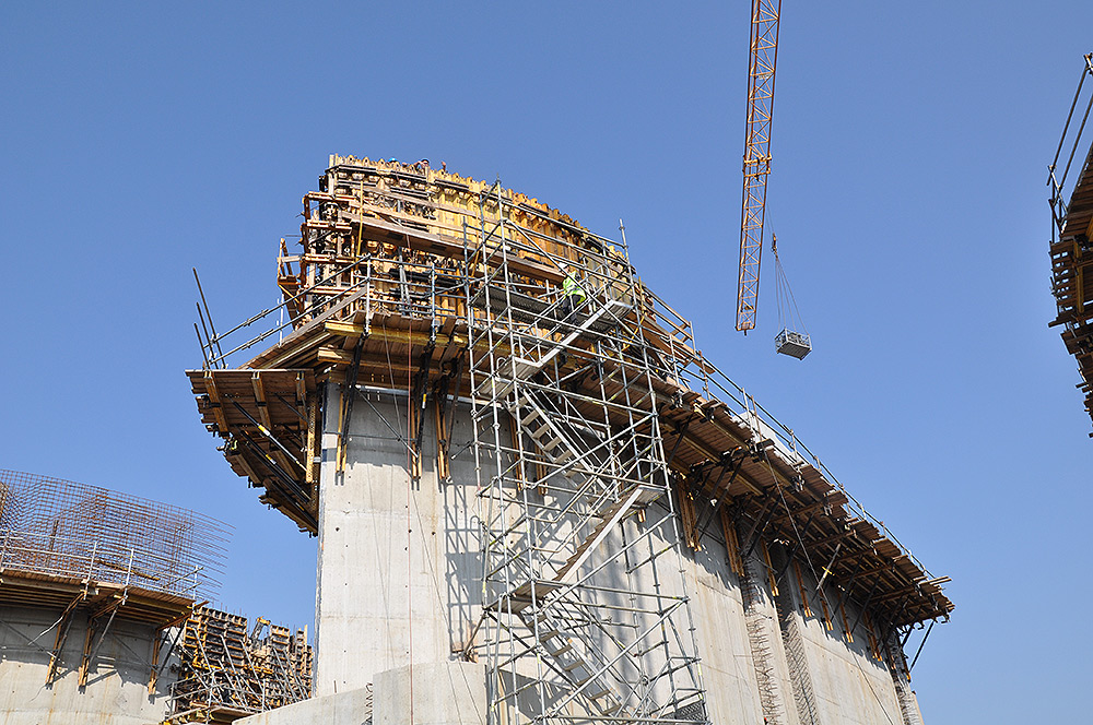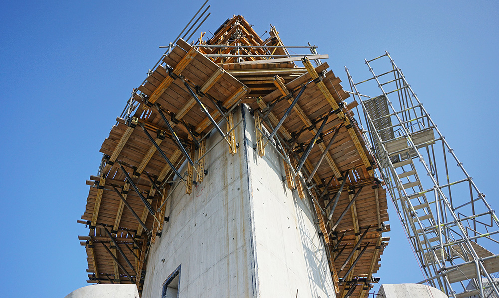 Für die freiliegenden Wände wurde die ORMA-Rahmenschalung verwendet, die eine hohe Leistungsfähigkeit bei minimalen Kosten vor Ort garantiert. Dies wurde mit dem BMK-Klettersystem kombiniert, das dank seiner Anpassungsfähigkeit das Ausloten der Schalung ermöglichte, ohne die anderen Elemente zu beeinträchtigen. Schließlich wurden Treppen BRIO verwendet, um den Arbeitsbereich zu erreichen.