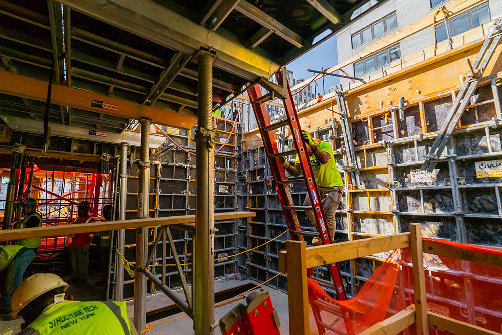 Dank der 9.755 m² CC-4-Moduldeckenschalung wurde die Geschwindigkeit und Effizienz des Deckenbaus gewährleistet. Durch die Konstruktion des Fallkopfes kann die Schalung um 15 cm abgesenkt werden, wodurch die Demontage des Materials erleichtert wird. Für die Errichtung der Außenwand des Gebäudes wurde eine schmale RKS-Kletterschalung konzipiert, die im Inneren des Gebäudes hydraulisch angehoben wurde.