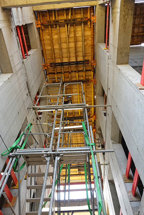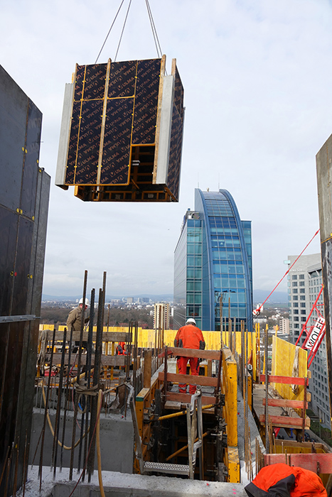 Neben der Wandschalung ORMA und der Stützenschalung F4 hat in erster Linie ein leistungsstarkes Baukastensystem rund um die Kletterkonsole CR-250 dazu beigetragen, den durch drei Bombenfunde zeitlich stark gestörten Bauablauf wieder auf den Stand zu bringen. Ein Ausbauraster von 1,30 m, eine weitestgehende Stützenfreiheit sowie die nahezu vollständig tagesbelichteten Räume tragen zu einer flexiblen Flächennutzung bei.