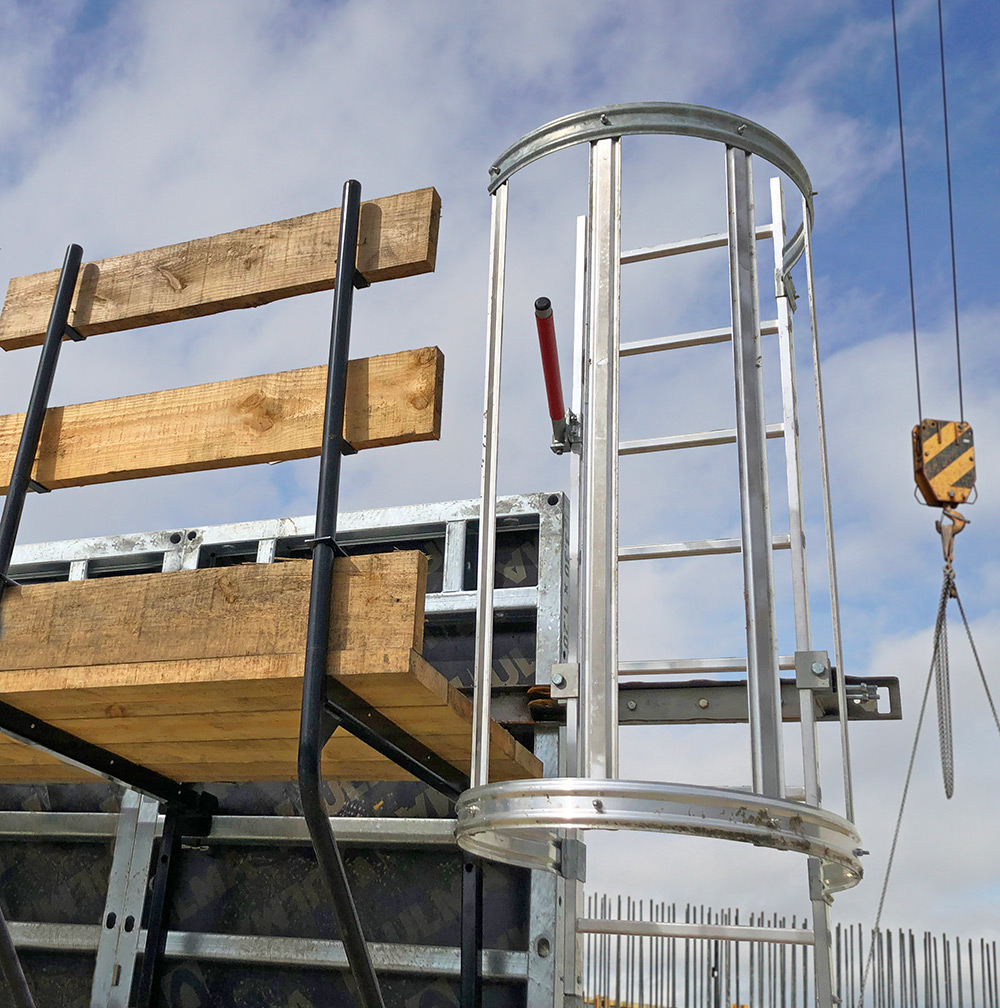 Universelle Sicherheitsleiter, die ein sicheres Auf- und Absteigen von und zu den Arbeitsbühnen ermöglicht. Die Montage ist schnell und einfach und erfolgt mit den Elementen auf dem Boden, um von Anfang an maximale Sicherheit zu gewährleisten. Das System ist mit allen ULMA Wandschalungssystemen kompatibel.