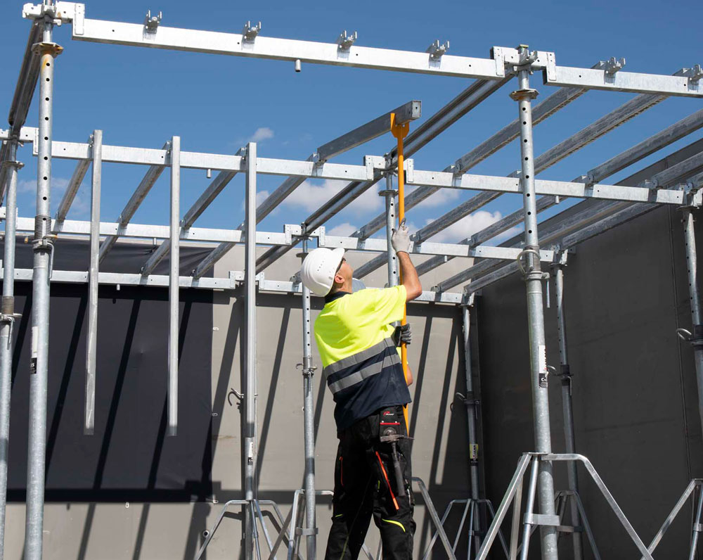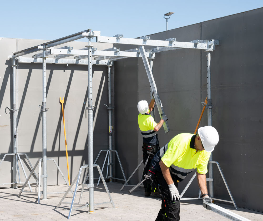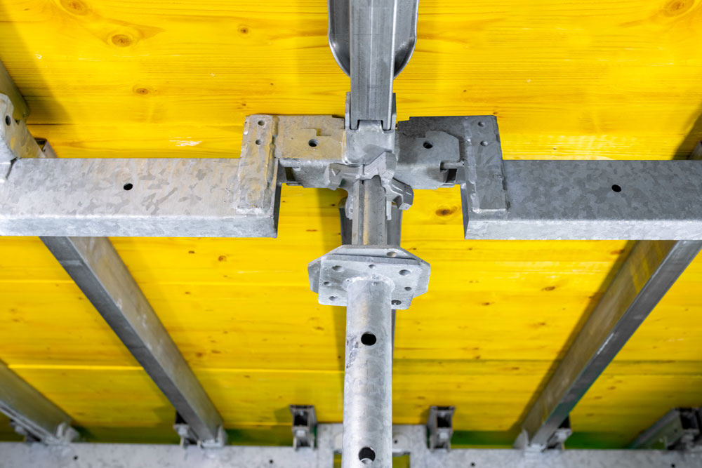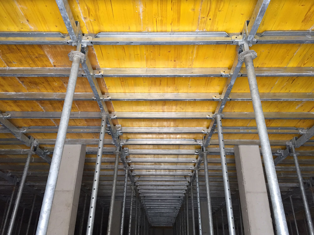 - Niedrige Stützrate: 0,4 Stützen/m² zum Betonieren und danach 0,2 Stützen/m² als Notunterstützung (Zwischenstützen können entnommen werden)