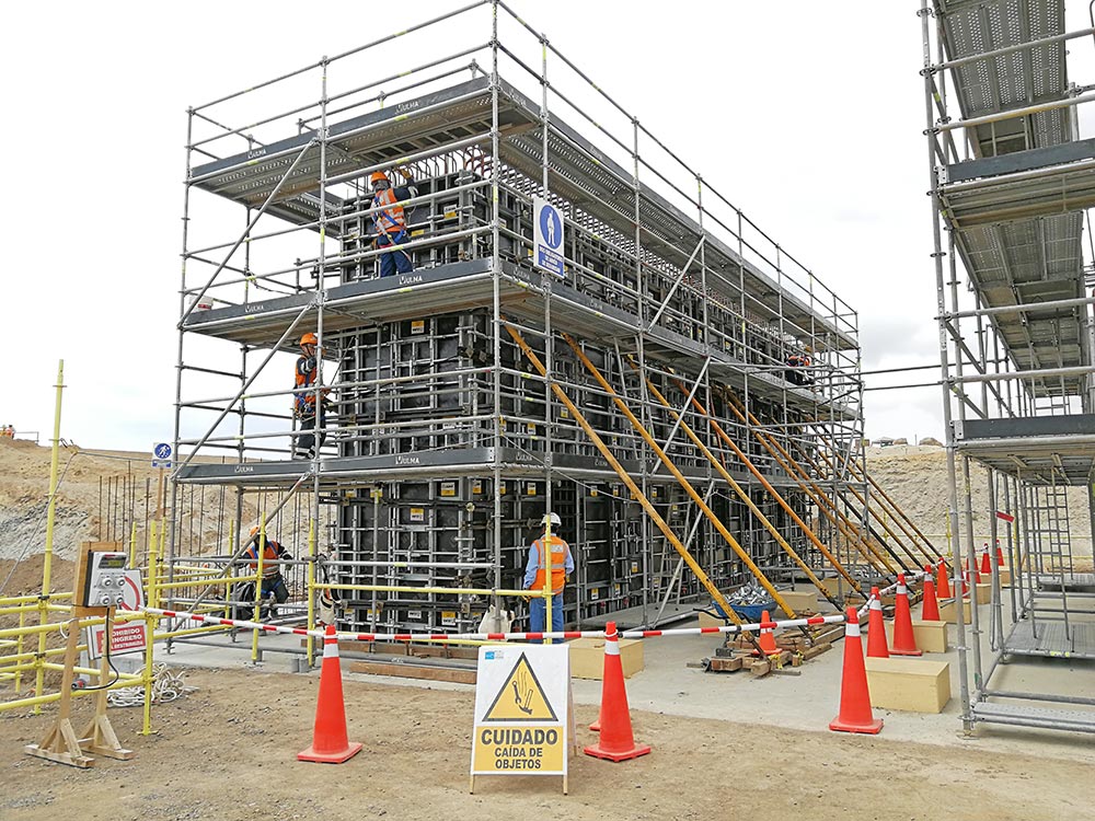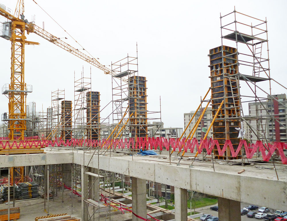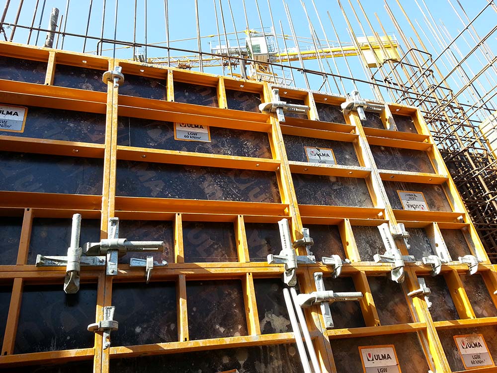 Leichte Rahmenschalung für den Hochbau (Wände, Stützen, Fundamente, Unterzüge). Besonders gut für den Wohnungsbau geeignet. Hohe Lebensdauer durch hochwertige und feuerverzinkte Stahlrahmen mit verstärkten Gussecken. Ein handliches System, das einfach zu bedienen ist, mit leichten Schnellspannern (1 kg) und Kleinteilen.