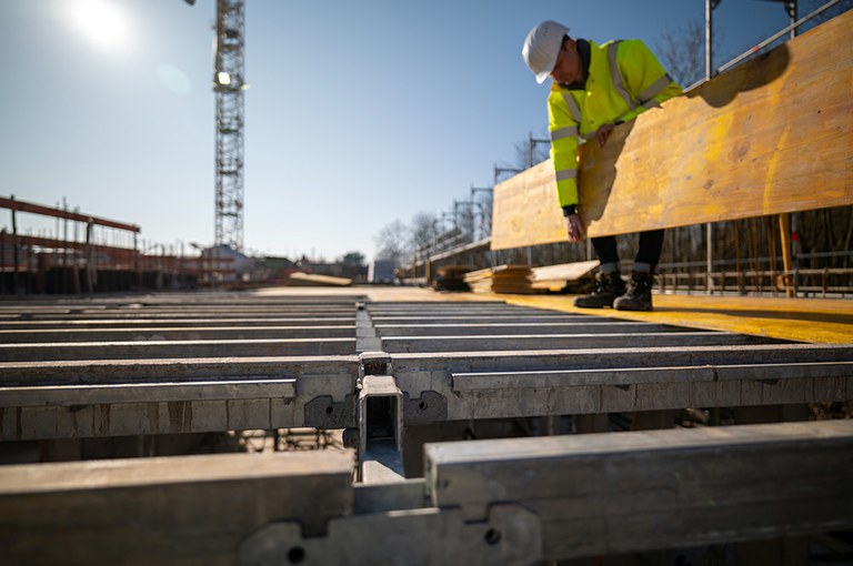 Unser ONADEK TOP-Trägerrost wird konsequent von unten eingeschalt, die Schalplatten verlegen wir von oben. Dank des Trägerabstands von nur 30 Zentimetern ist beim Einlegen der Schalplatten keine bewegungseinschränkende persönliche Schutzausrüstung gegen Absturz (PSAgA) mehr erforderlich.