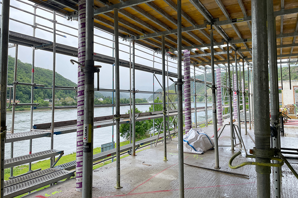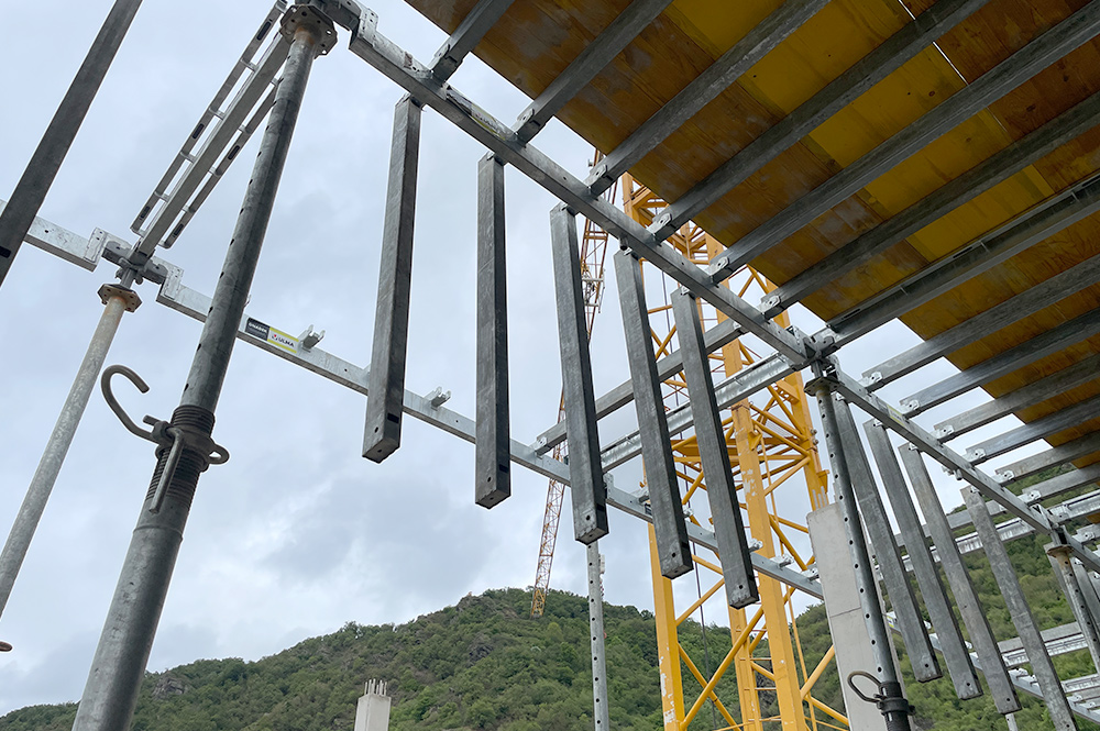 Dabei setzen wir auf ein leichtes System aus hochfestem, verzinktem Stahl mit einem Grundraster von 2,50 x 2,00 Metern. Das schwerste Bauteil – der 2,50 Meter lange Hauptträger – wiegt lediglich ca. 18 Kilogramm. Alle weiteren Systemteile sind deutlich leichter – zum Teil sogar leichter als herkömmliche Holzträger. Das eröffnet uns völlig neue Möglichkeiten im Baustellenalltag, insbesondere bei Überkopfarbeiten. Es wird kein zusätzliches und teures Gerät zum Einschalen benötigt.
