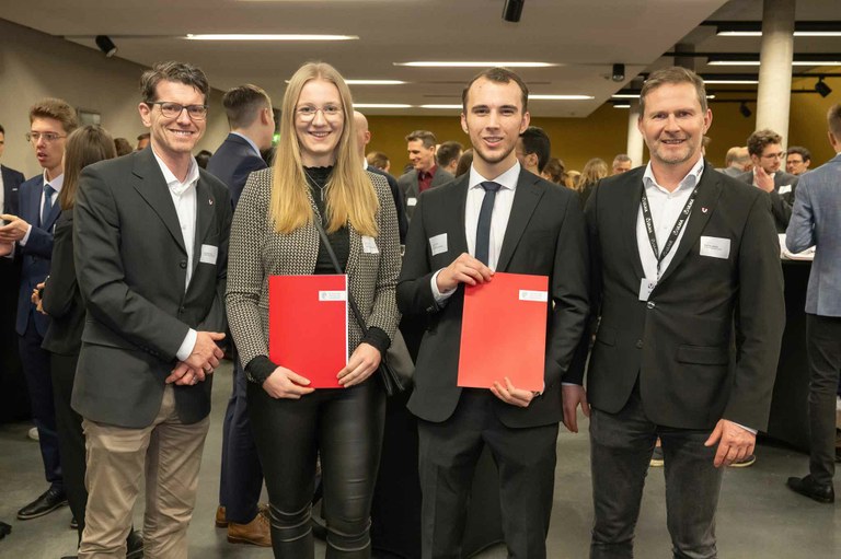 Im Rahmen der Stipendienfeier an der Technische Universität Darmstadt am 1. Februar überreichten der Geschäftsführer von ULMA Construction in Deutschland Matthias Oeckel (rechts) und der Marketingleiter von ULMA Construction in Deutschland, Andreas Högn (links), die offiziellen Urkunden an seine zwei Stipendiaten, Frau Helene Paffe und Herrn Anton Eger überreichen.